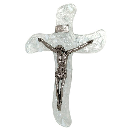 Cruz de parede em vidro de Murano branco com corpo de Cristo em zamak prateado, em formato médio de 32x21 cm.