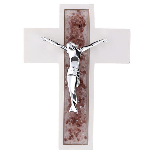 Cruz de parede em resina branca com efeito madeira, com inserto central em vidro de Murano cor-de-rosa e figura de Cristo em metal cromado.