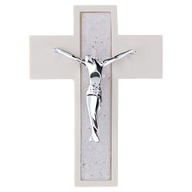 Crucifixo efeito madeira prateado corpo em resina branca 16x8 cm