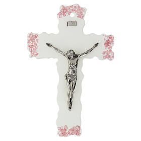 Cruz Murano em vidro branco com aplicações cor-de-rosa e Cristo 16x10 cm