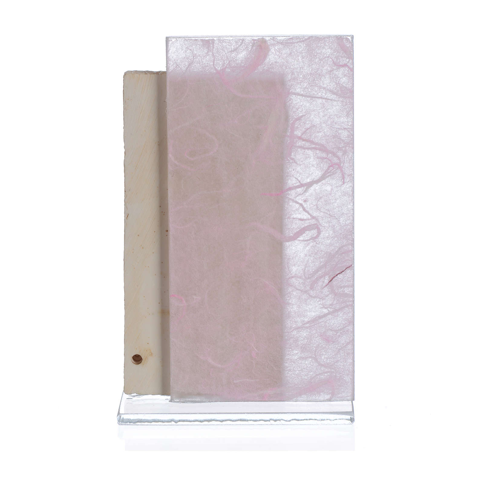 Adorno Anjo papel seda cor-de-rosa h 11,5 cm. Adorno de mesa placa em pó de mármore com anjo da guarda em baixo-relevo e vidro com aplicação de papel seda cor-de-rosa.