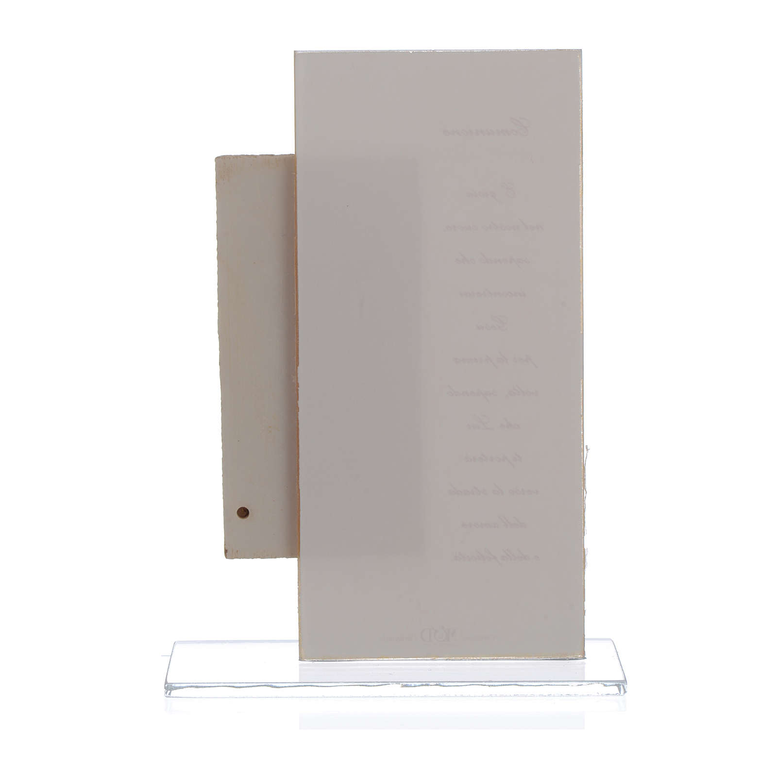 Adorno Comunhão menino com impressão h 15,5 cm. Adorno de mesa com imagem em relevo de menino no dia da primeira comunhão e oração em italiano impressa no verso do vidro.