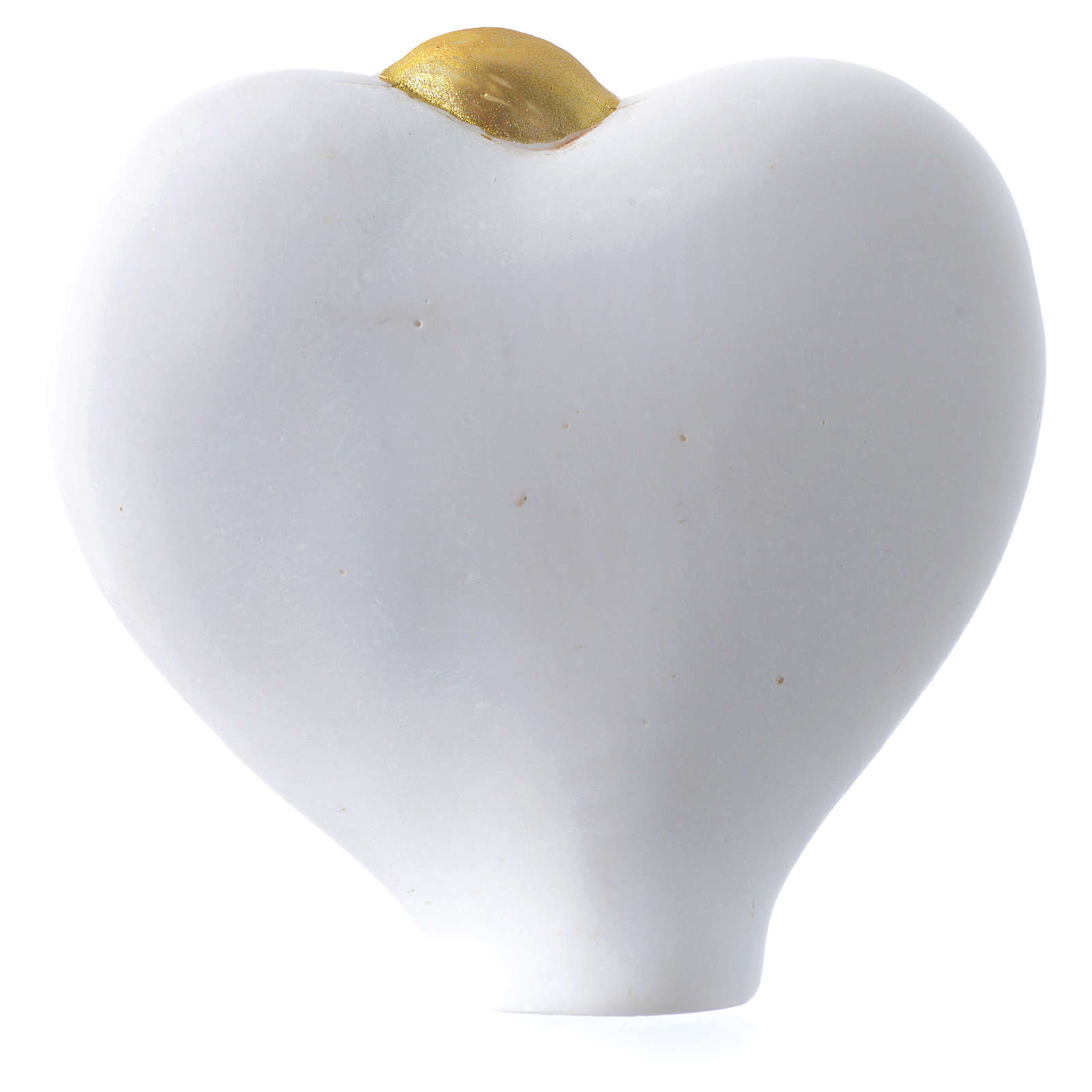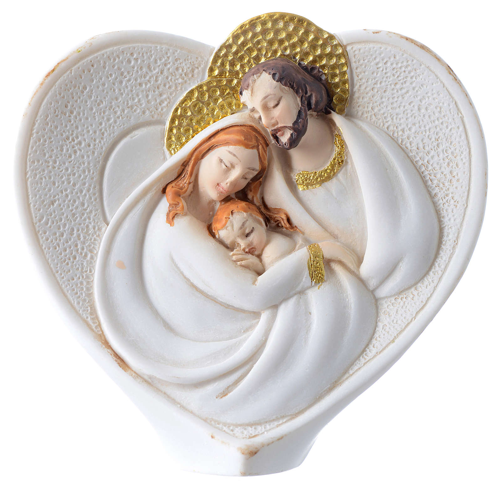 Adorno coração Sagrada Família 6x6 cm. Adorno de mesa em forma de coração com imagem em baixo-relevo da Sagrada Família, adequado como lembrancinha ou marcador.