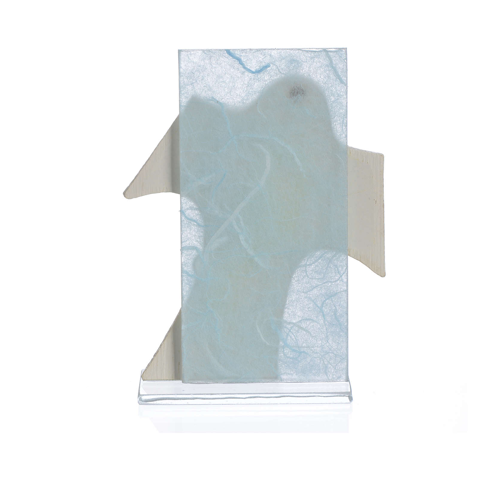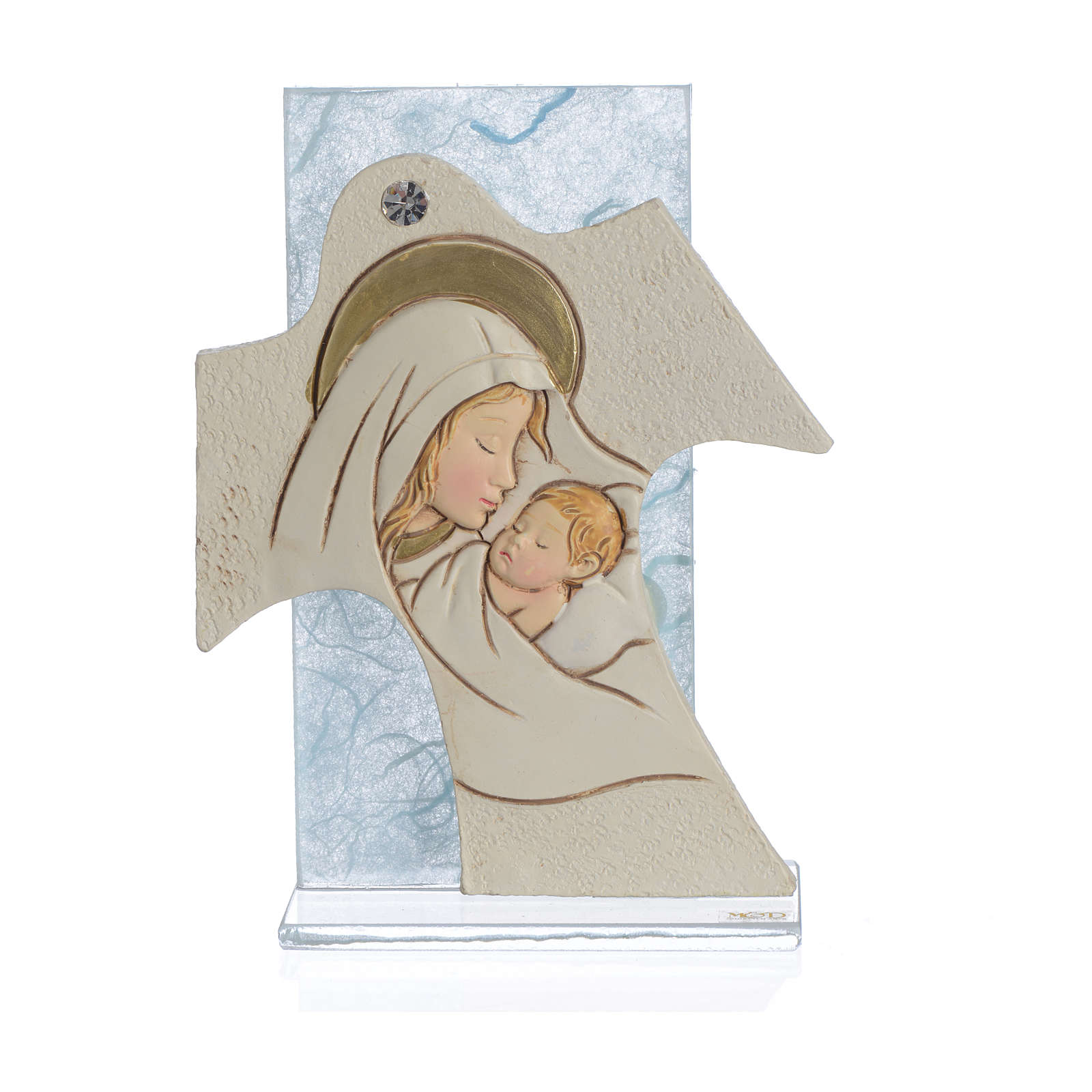 Adorno cruz nascimento maternidade azul 11,5x8 cm. Adorno de mesa composto por uma placa em vidro cristalino com découpage azul claro, uma cruz em pó de mármore com imagem da Virgem com o Menino e um strass em cristal.