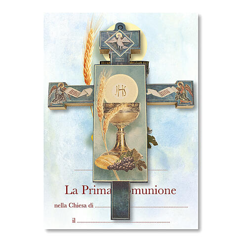 Cruz lembrança Primeira Comunhão com certificado emblemas Eucarísticos 13,5x9,5 cm.