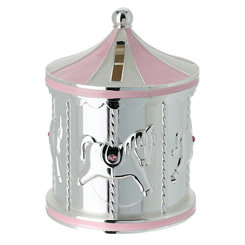 Lembrancinha cofrinho em formato de carrossel com cavalos cor-de-rosa 12 cm.