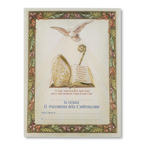 A imagem, impressa e enriquecida com detalhes em ouro quente, representa a simbologia do Sacramento da Confirmação.