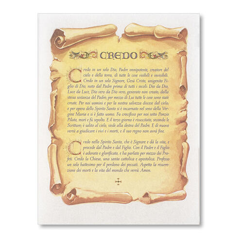 Pergamena riportante il Credo come da immagine. Acquistata per donarla ai ragazzi che iniziano la catechesi, dopo la Prima Comunione, in preparazione alla Cresima per fargli prendere la consapevolezza del cammino di testimoni che li attende. Utile da consegnare anche nel giorno della Cresima e in occasione del rinnovo della fede.