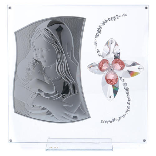 Quadro para batismo com flor cor-de-rosa 23,5x23,5 cm. Quadro em vidro decorado com cristais, flor cor-de-rosa e imagem da Virgem com o Menino impressa na placa de prata.Ideal como presente para o batismo.