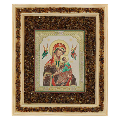 Ícone com moldura de madeira, borda dubla e pedrinhas ambarinas.