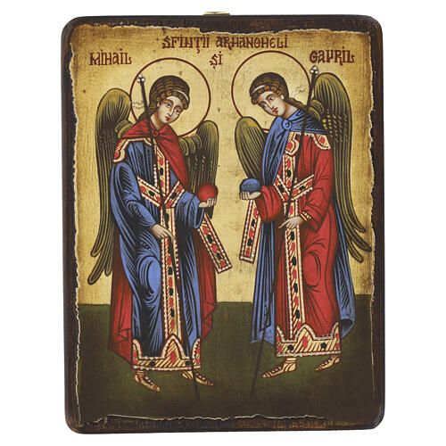Ícone Roménia pintado à mão Arcanjos Miguel e Gabriel estilo envelhecido 18x15 cm