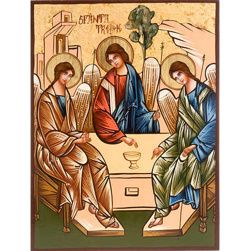 Ícone Santíssima Trindade de Usakov Roménia. Reprodução da Santíssima Trindade de Usakov da escola imperial do Tsar Boris Godunov, inspirada pela Trindade de Rublëv, mas com tons mais leves. Os anjos, prefigurações das três pessoas de Deus, estão representado num clima de paz e serenidade. O Filho no centro e o Espírito Santo à direita olham o Pai.