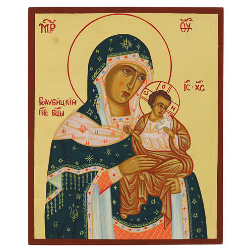 Representação de Maria segurando o Menino Jesus, pintada à mão seguindo a tradição da escola iconográfica bizantina com estilo russo. Maria veste um traje vermelho com manto verde, enquanto Jesus é retratado segurando uma pomba branca na mão esquerda, símbolo do Espírito Santo, e a mão direita levantada em sinal de bênção.
