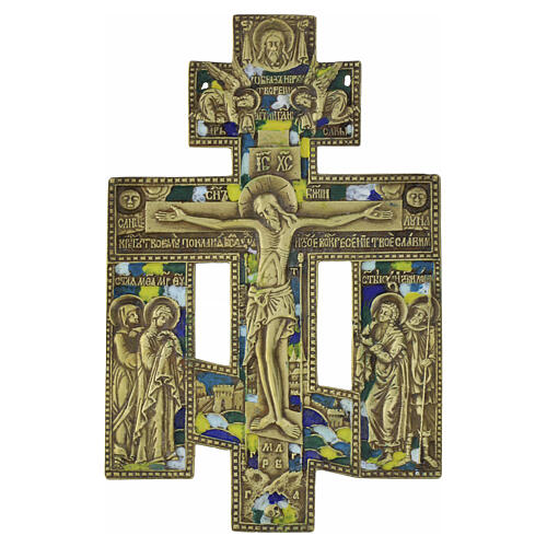 Magnífico crucifixo em bronze enriquecido por esmaltes coloridos, datável ao início do século XIX, expressão refinada da tradição iconográfica da Europa Oriental. A cruz segue a típica estrutura de três travessas, com a inferior inclinada, símbolo da «balança da justiça»: de um lado o bom ladrão acolhido no Paraíso; do outro, o mau ladrão que se afasta da salvação.