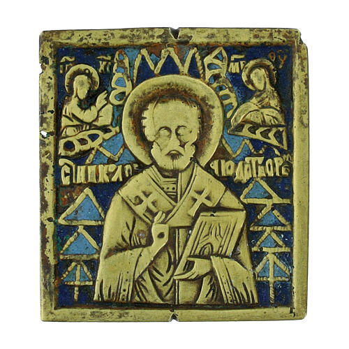 Ícone de viagem antigo em bronze esmaltado São Nicolau século XIX 5x4,5 cm