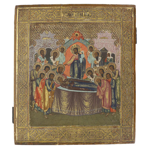Ícone russo antigo Dormição da Mãe de Deus século XIX 35x30 cm.