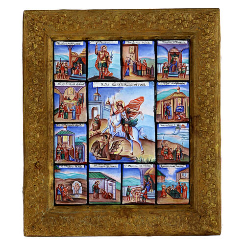Ícone São Jorge e cenas de vida esmaltes Finift Rússia séc. XX 34x29 cm