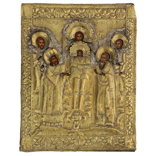 Todo o ícone é ricamente decorado por uma cobertura (riza) de latão dourado martelada à mão, que deixa visíveis só os rostos e as mãos dos Santos e de Jesus Salvador. Antes de pintar a obra com têmpera de ovo, a madeira é revestida com levkas, uma mistura de gesso, óleo de linhaça e óleo de esturjão, segundo a tradição.