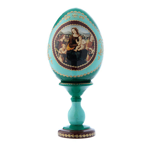 Ovo russo em madeira verde Virgem com o Menino São João Batista e Anjos h tot 16 cm. Ovo estilo Imperial russo em madeira verde com imagem estilizada da "Virgem com o Menino São João Batista e Anjos" de Lorenzo di Credi em découpage e decorações pintadas à mão.