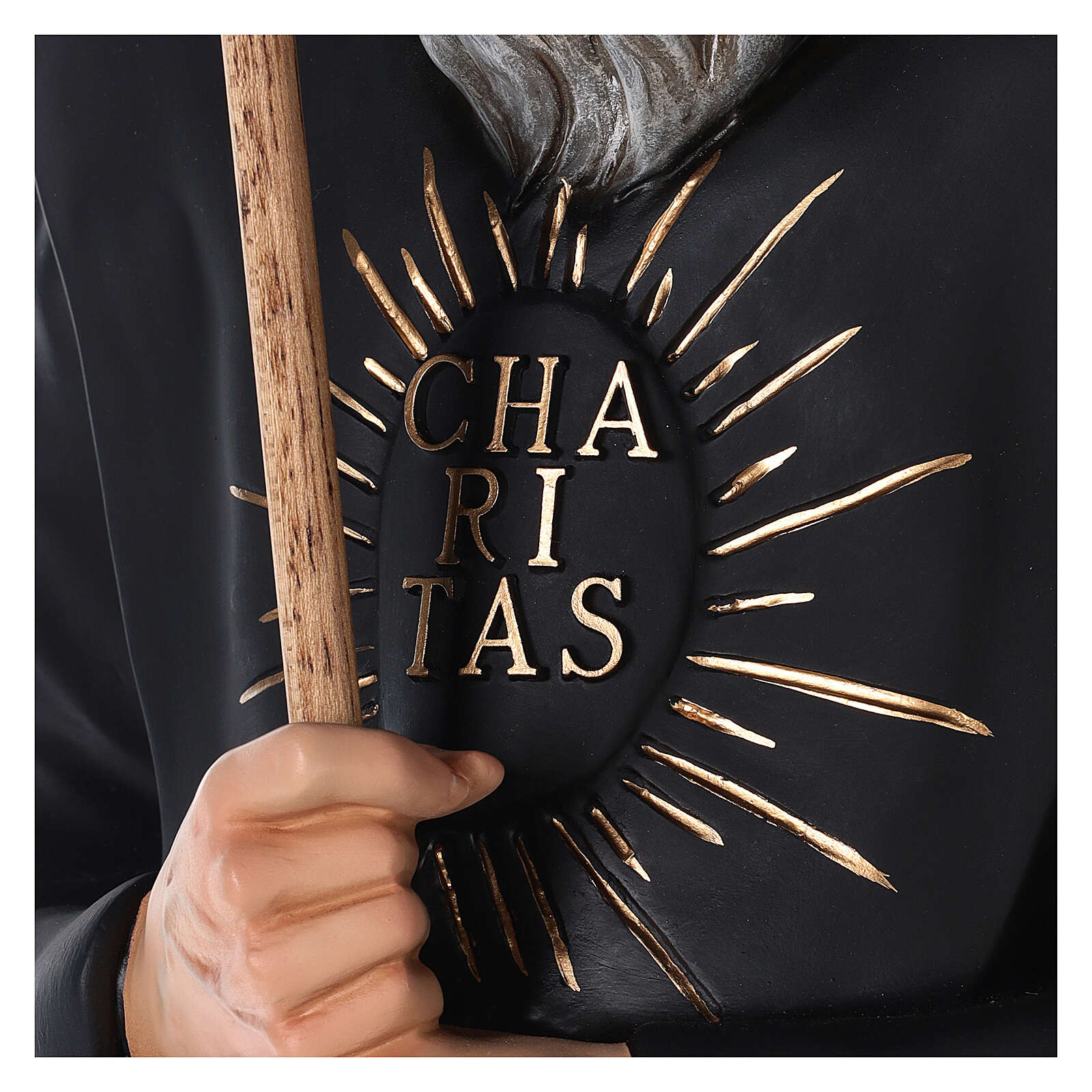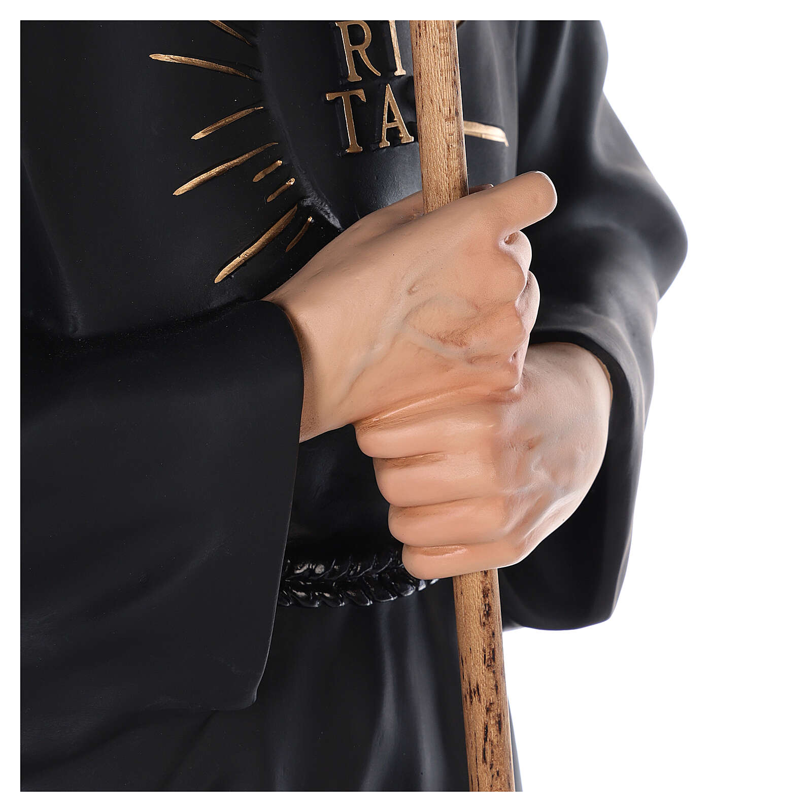 A estátua é inteiramente realizada à mão, da moldagem até o acabamento, por uma empresa italiana de grande experiência na criação de mobiliário religioso.
