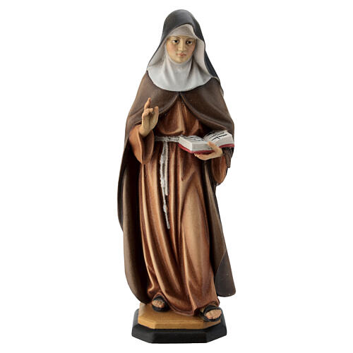 Imagem Monja clarissa madeira pintada Val Gardena. Imagem esculpida no Val Gardena (Itália), representando uma monja clarissa com uma bíblia nas mãos, realizada e pintada à mão em madeira de bordo nos modelos até 45 cm de altura e em madeira de tília nos modelos de 70 cm a 180 cm.