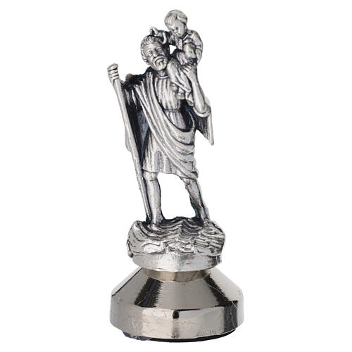 Estatueta em zamak prateado que representa São Cristóvão com o Menino Jesus às costas e um bastão, montada sobre base magnética de metal.