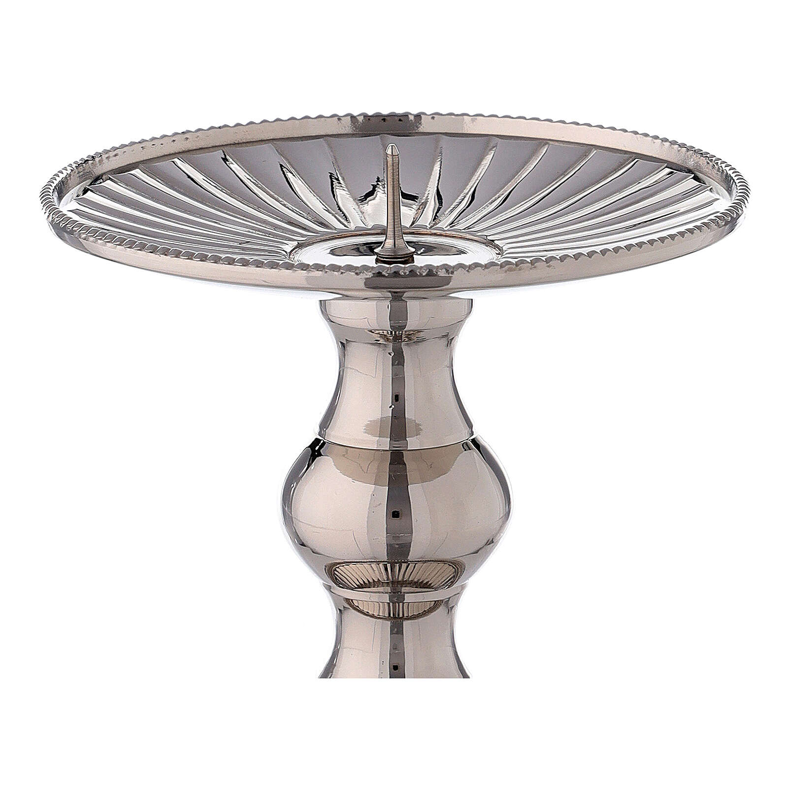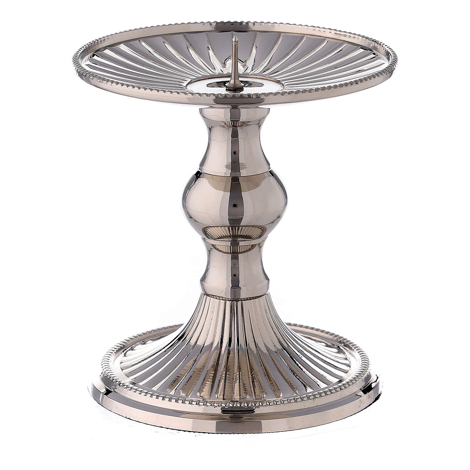 Castiçal de altar latão niquelado 9 cm. Castiçal em latão niquelado com base renhurada e nó torneado, prato riscado com pino central de 9 cm de diâmetro.