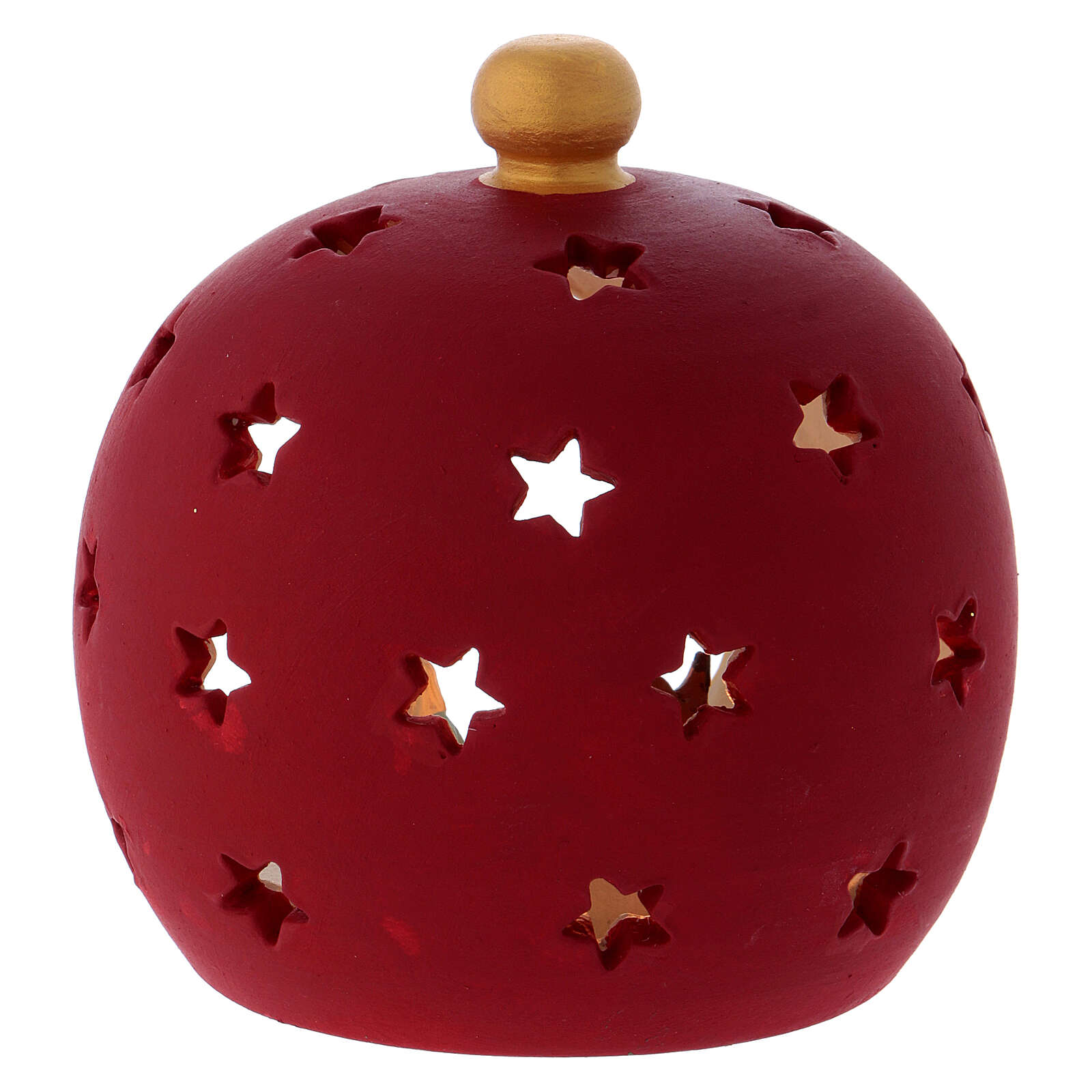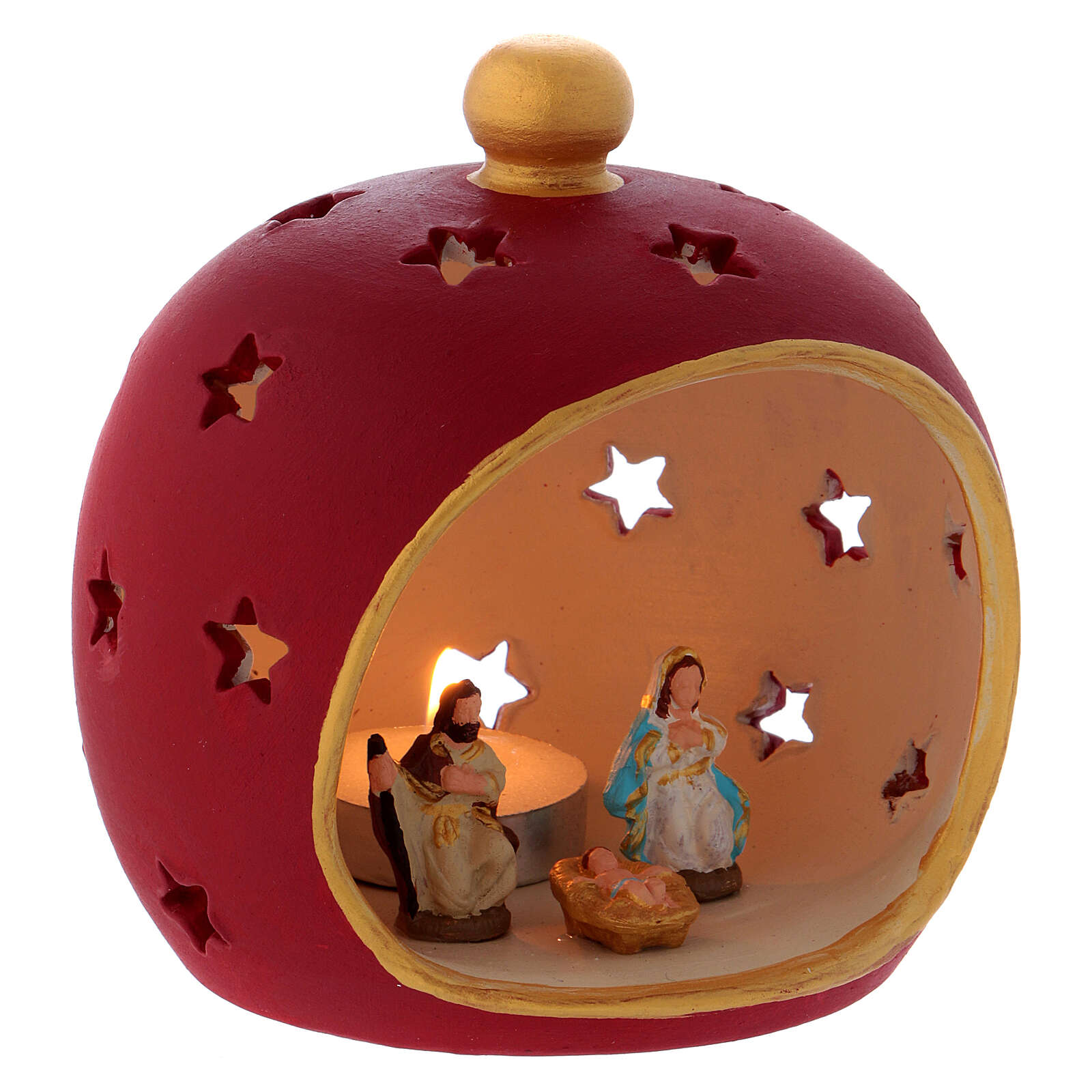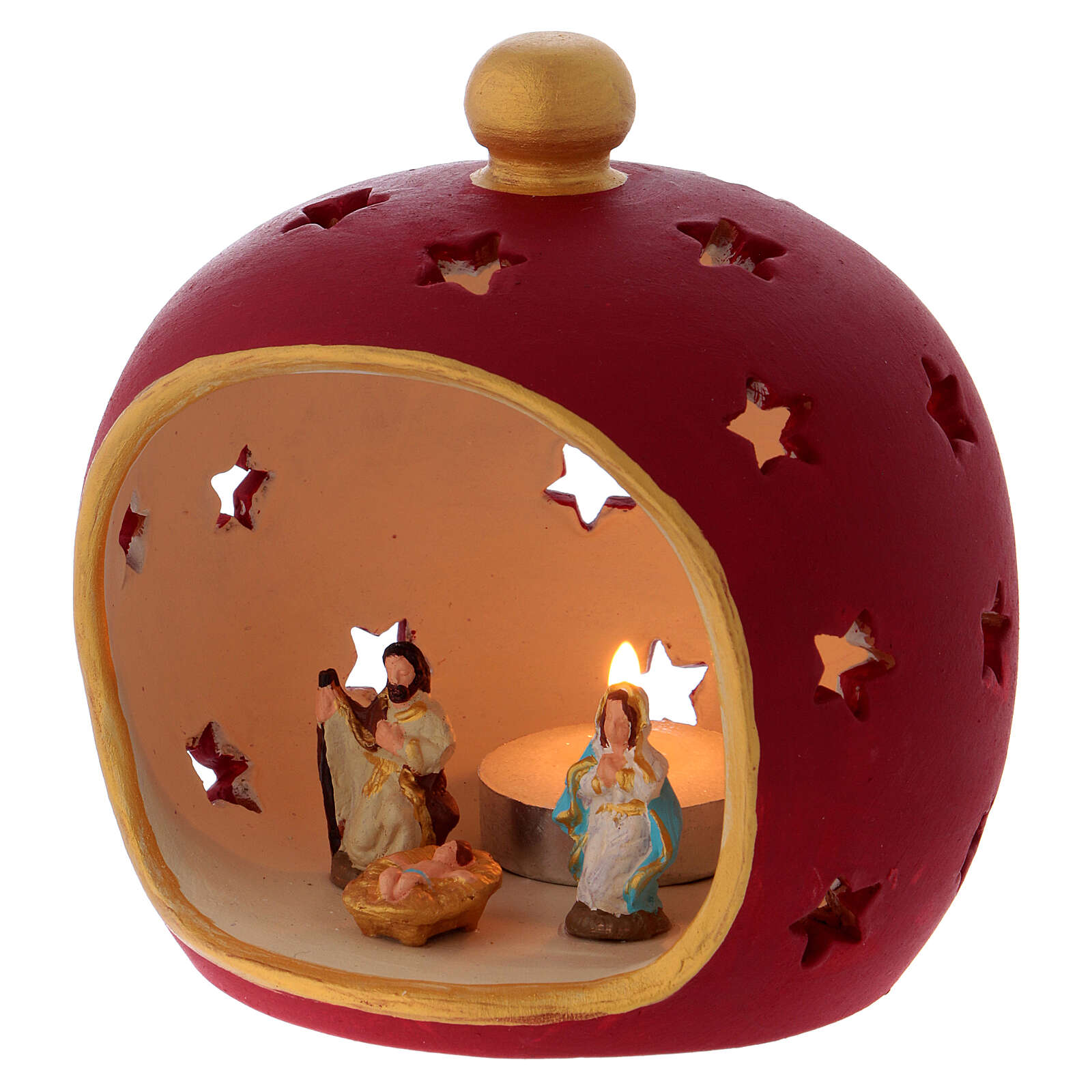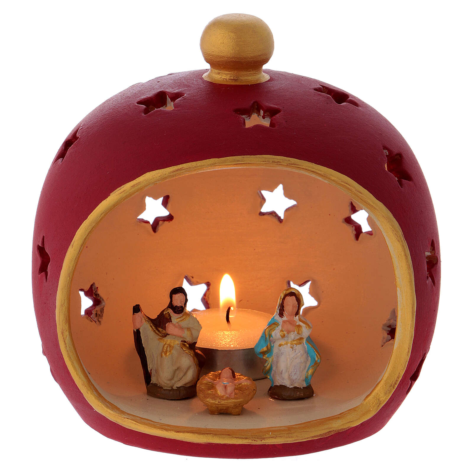 Porta-vela redonda bordô com Sagrada Família terracota Deruta.Linda porta-vela bordô em terracota com pequenos furos em forma de estrela realizado à mão por artesãos de Deruta, aldeia italiana famosa em todo o mundo pelas suas obras de arte em terracota. Dentro do porta-vela são colocadas as figuras da Sagrada Família, o Menino Jesus, a Virgem Maria e São José.Porta-vela adequada para velas de 4 cm de diâmetro.