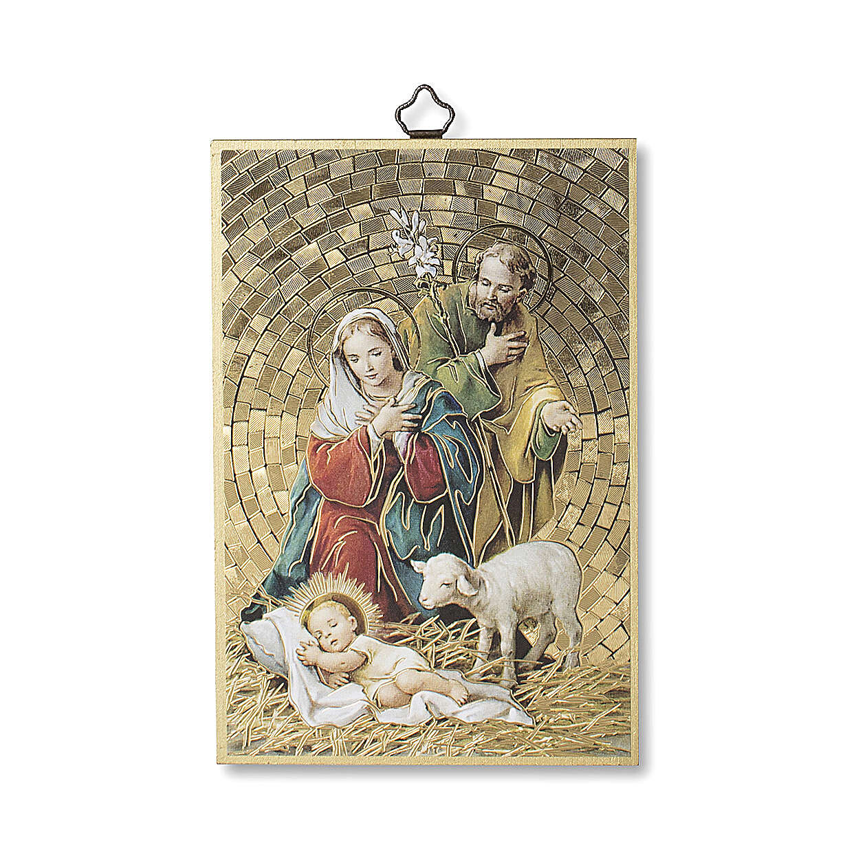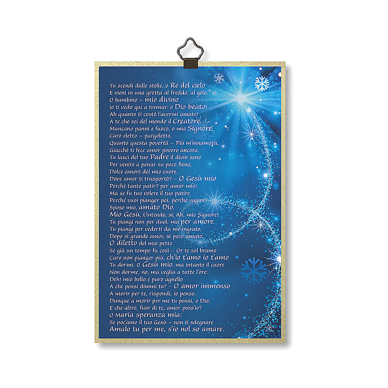 Impressão na madeira Presépio Canção Natal ITA. Imagem original da empresa Fratelli Bonella aplicada sobre fundo luminoso mosaico em chapa dourada. Os bordos do quadro são pintados em ouro e no verso há o texto de uma canção de Natal em italiano.