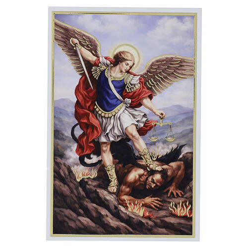 Imagem de São Miguel Arcanjo em postura dinâmica, com cores vivas em tons de vermelho e azul e detalhes decorativos na armadura e nas asas.