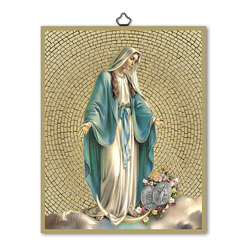 Este lindo quadro em madeira, com um fundo dourado efeito de mosaico, destaca a imagem de Nossa Senhora das Graças, representada com um manto branco, cinturado com a cor celeste, e envolta em um manto do mesmo tom. Seus pés são ornados com delicadas flores que emolduram uma medalha; esta mede a imagem completa de Nossa Senhora e, ao verso, o símbolo mariano ao lado de dois corações.