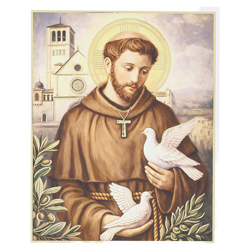 A imagem apresenta São Francisco de Assis em pose frontal, com tonalidades quentes e detalhes pictóricos que incluem elementos simbólicos franciscanos.