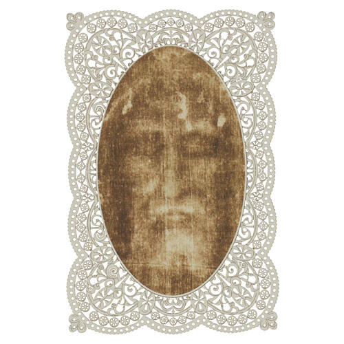 Santinho do Santo Sudário com rosto de Cristo 12x7 cm decoração em renda.