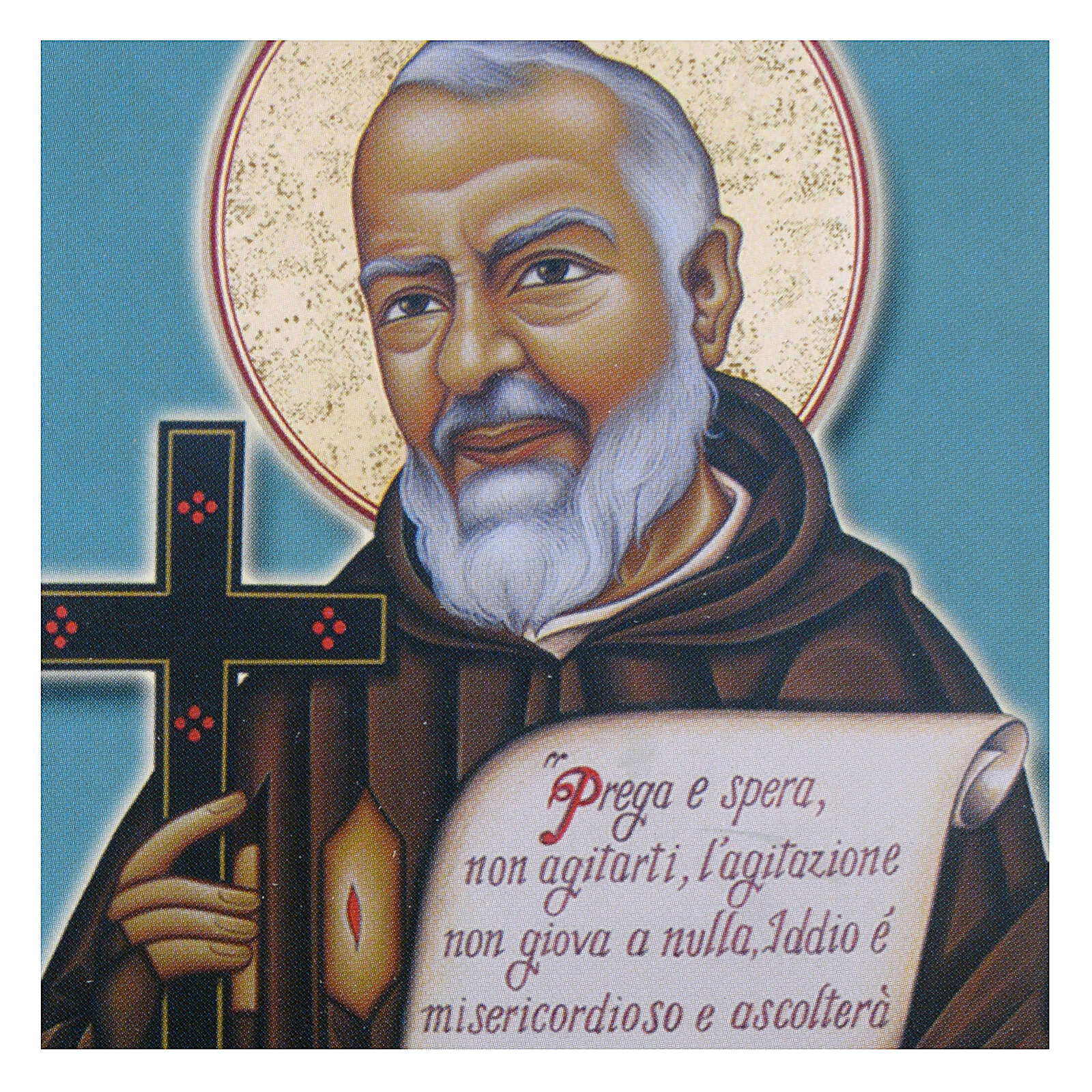 O Santinho representa São Padre Pio com a cruz na mão direita e uma frase do santo na mão esquerda (em italiano: "Prega e spera, non agitarti, l'agitazione non giova a nulla. Iddio é misericordioso e ascolterà la tua preghiera").