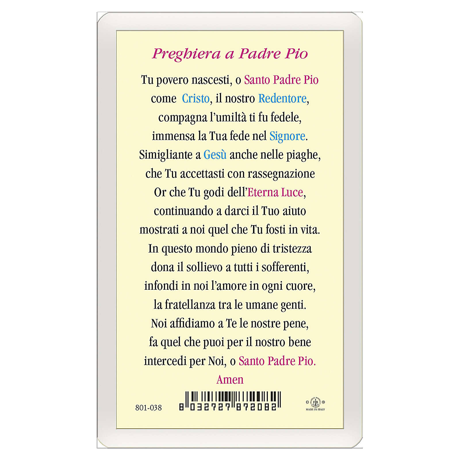 O Santinho representa num lado a imagem de São Padre Pio e no outro uma oração em ITALIANO.