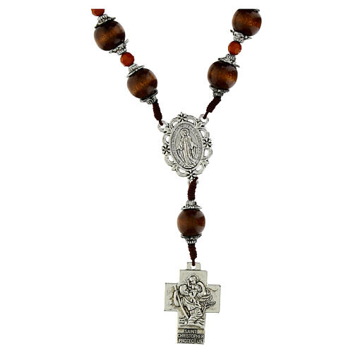 Este terço dezena de 24 cm de circunferência é completado por uma medalha da Nossa Senhora das Graças em metal e por uma cruz em metal com imagem de São Cristóvão e da Sagrada Família, medindo 3x2,5 cm.