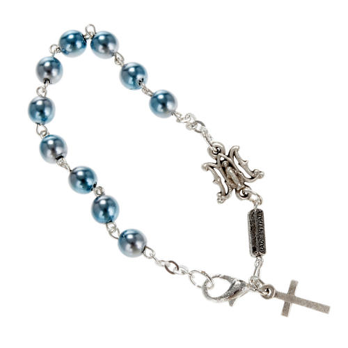 Pulseira dezena Ghirelli vidro Boémia azul mariano. Pulseira dezena Ghirelli com contas em vidro de Boémia verdadeiro e símbolo mariano em latão prateado.