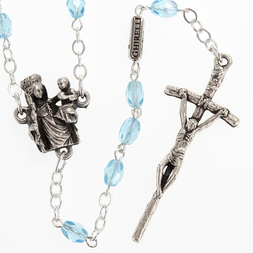 Terço Ghirelli Notre Dame de Paris conta oval 6x4 mm. Terço Ghirelli realizado com contas ovais em vidro com corte cristal. Corrente, cruz e medalha são em latão prateado. A medalha representa a Nossa Senhora de Paris.