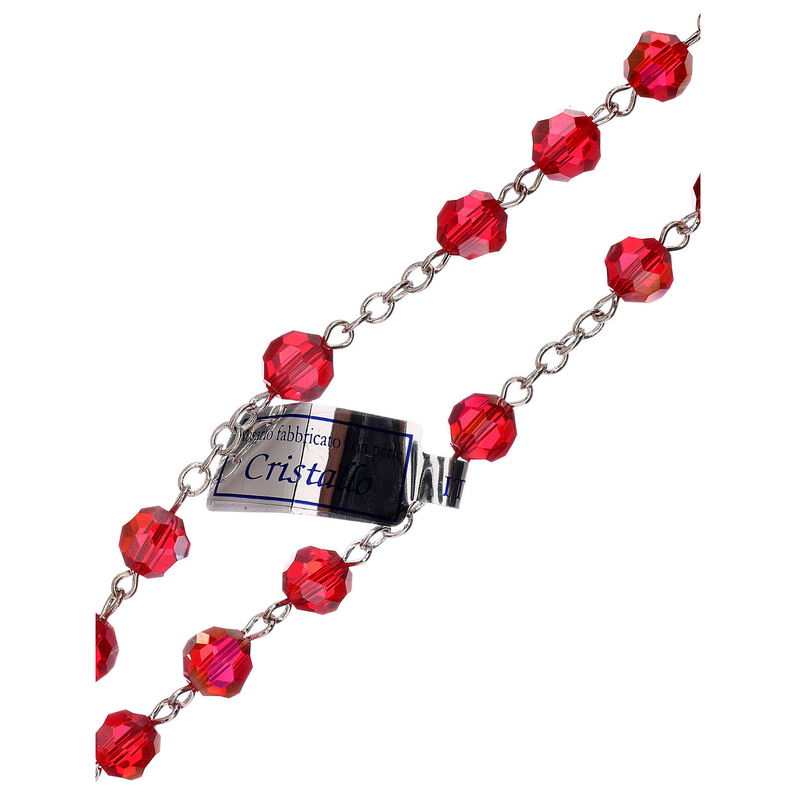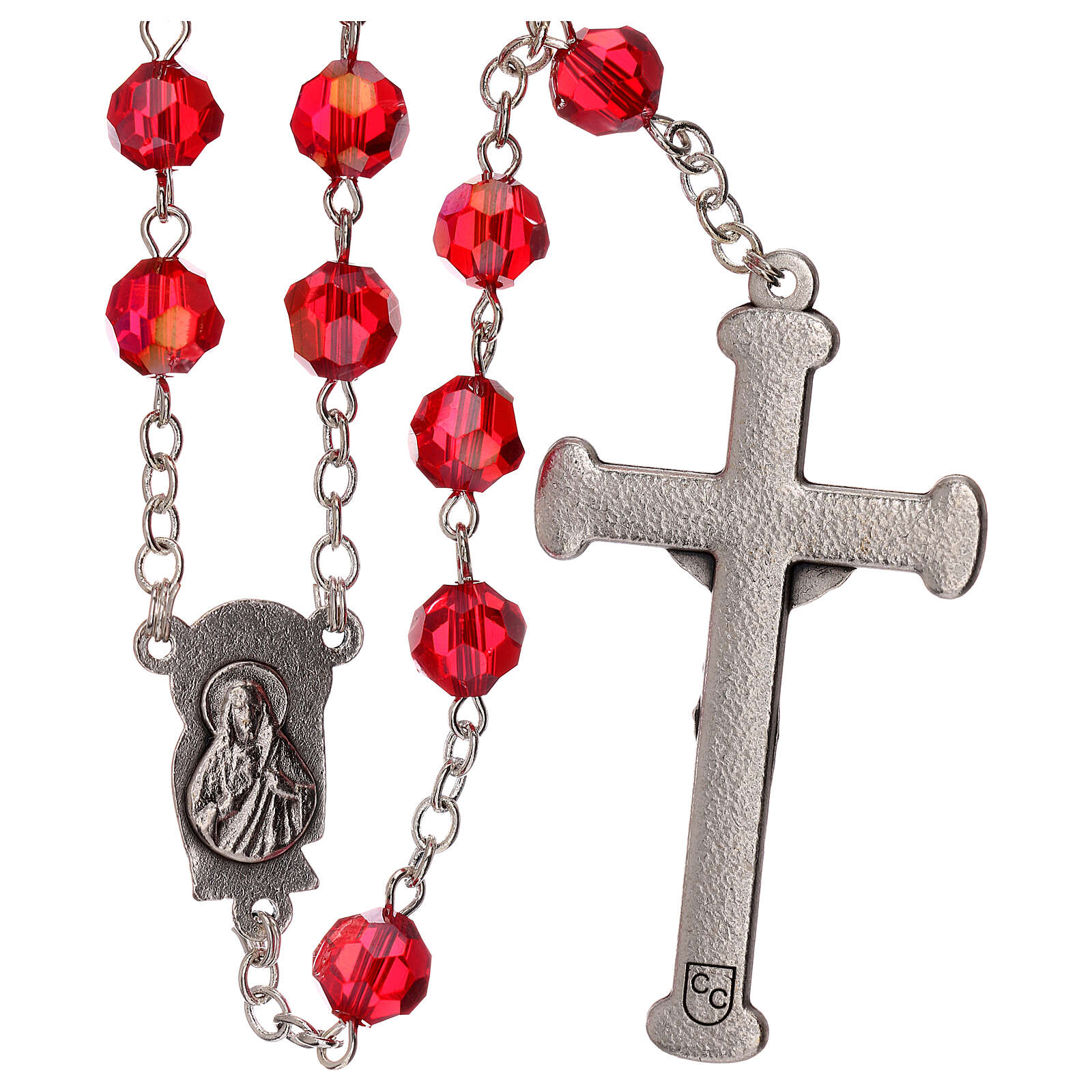 Terço cristal veremelho contas 5 mm Nossa Senhora da Misericórdia. Terço colar prateado com contas de cristal vermelho de 5 mm.