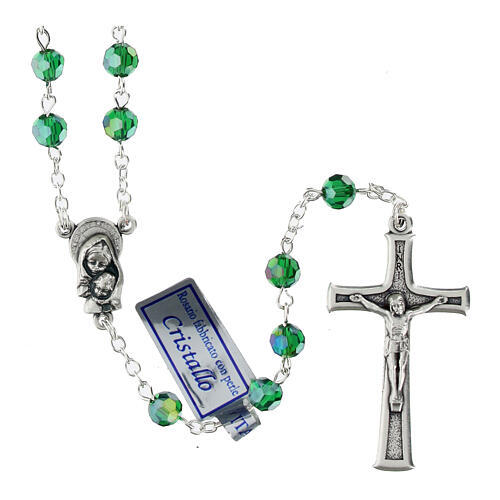 Terço em cristal esmeralda e metal oxidado. Terço cor de esmeralda em cristal lapidado, efeito aurora boreal, com cruz e medalha em metal oxidado.
