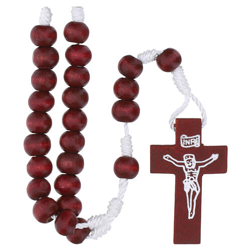 As contas, em tonalidade vermelho escuro, estão ligadas por elos metálicos; cruz coordenada em madeira com aplicação representando o Cristo.