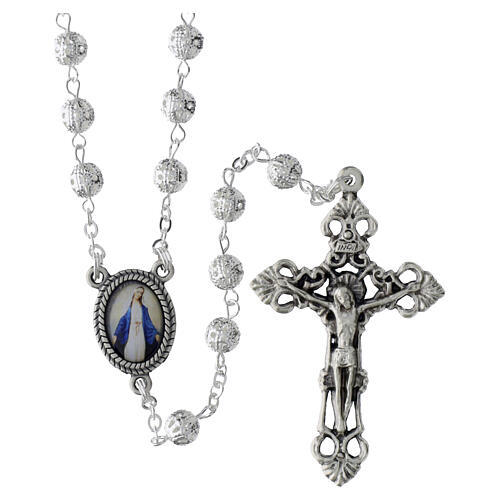 Terço filigrana metal prateado 6 mm Milagrosa. Terço realizado com contas redondas em metal prateado imitação filigrana de 6 mm por um modelo elegante, refinado e muito leve.