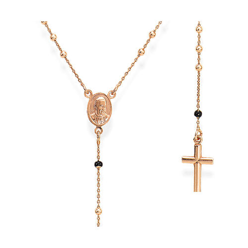 Elegante terço de prata 925 rosada formado por contas do mesmo material e contas do Pai Nosso pretas. O passador do terço é uma medalha que representa num lado a Nossa Senhora das Graças e no outro o Papa Francisco.