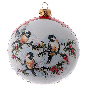 Bola de Natal vidro branco e vermelho com imagem de passarinhos em ramos de azevinho