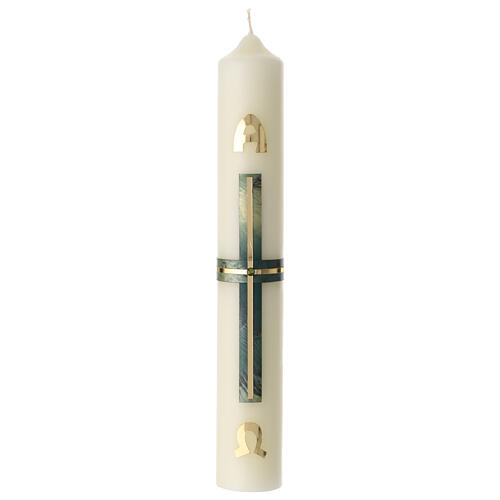 Círio cruz ouro mármore verde 40x6 cm. Círio de mesa decorado com uma cruz verde efeito mármore, realçado no centro por uma alma em fio dourado e um cristal verde. Nas extremidades da cruz, as letras Alfa e Ómega em ouro completam o design. Produto por uma histórica empresa de velas alemã, conhecida por sua experiência e qualidade, este círio é artesanal, feito com uma mistura de 90% de parafina e 10% de cera de abelha. Dimensões: Altura: 40 cm; Diâmetro: 6 cm.