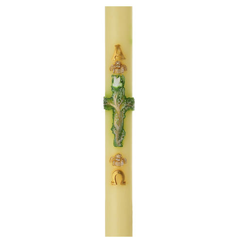Círio pascal de parafina refinada, produzido por vazamento e decorado em relevo com a Árvore da Vida e uma pomba aplicada ao centro. Acabamento em cor de marfim com a árvore estilizada desenvolvida verticalmente e pomba sobreposta; detalhes dourados realçam os ramos e os contornos simbólicos sobre uma superfície uniforme.