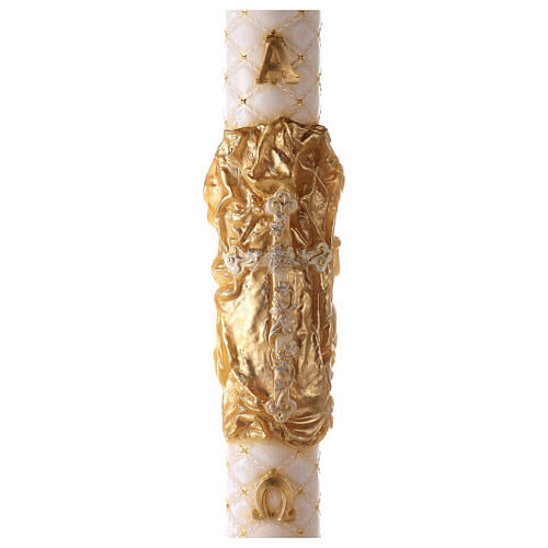 Este círio é pintado à mão com grande precisão e presenta uma decoração branca estilo matelassê e imagens em relevo de cruz sobre pano dourado e letras Alfa e Ómega.