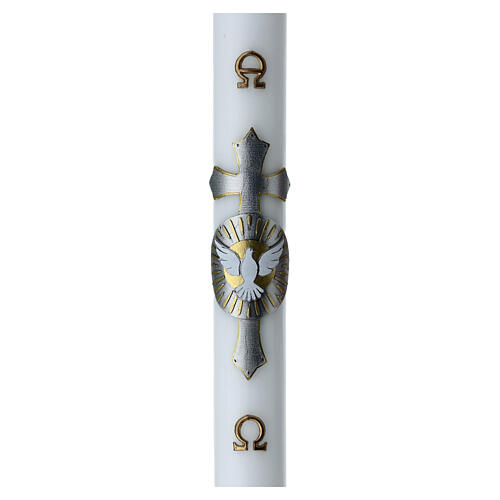 Realizado em cera branca com superfície opaca e uniforme, este círio apresenta uma decoração central que representa a pomba do Espírito Santo em voo, colocada sobre uma cruz prateada com raios prateados dispostos em círculo.