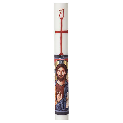 Círio pascal em cera branca decorado com imagem pintada à mão. No centro, está representado o meio busto de Jesus, com a mão direita abençoando o observador. Acima da imagem, destaca-se uma cruz estilizada em vermelho, enquanto acima e abaixo aparecem os símbolos do Alfa e do Ómega.