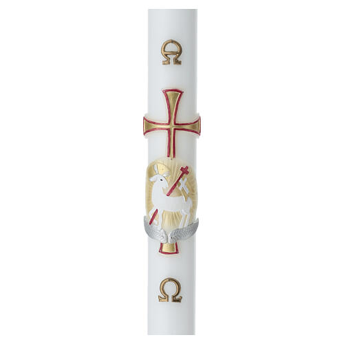 Círio pascal de 90x8 cm em cera branca com decoração central em relevo que representa o Cordeiro de Deus com estandarte vermelho sobre fundo dourado, emoldurado por uma cruz vermelha com borda branca.